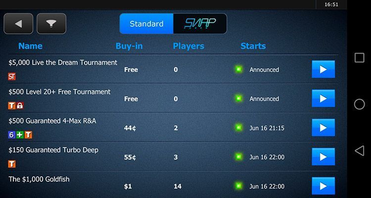 888 poker no Android da-lhe possibilidades de jogar torneios exclusivamente de Texas Hold-em. Se voce nao tem a possiblidade de eescolher uma mesa em concreto em torneios Sit-n-Go ou para jogos de cash(existe o principio de auto entrar numa mesa de acordo com certos criterios) entao no MTT voce pode meter um filtro de acordo com os buy-ins, e também a velocidade dos torneios;ver o nome do torneio, o buy in, o numero de jogadores registados e o estado do torneio; voce podera entrar em qualquer lobby e ver informações adicionais.